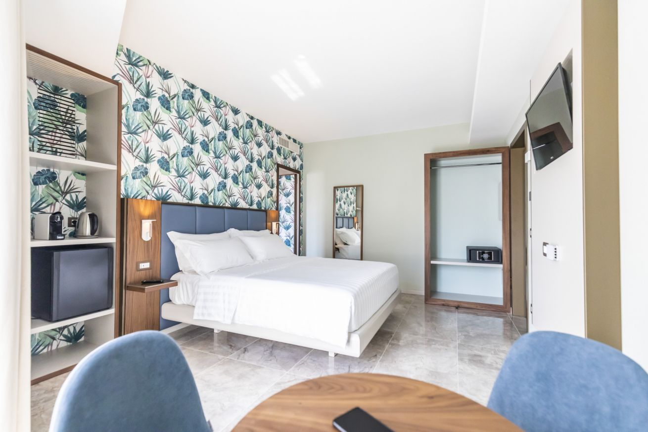 Camera Matrimoniale con bagno privato con finestra dotata di aria condizionata, tv, wifi, telefono interno, phon, bollitore, macchina per caffè, frigobar, cassaforte, angolo relax e balconcino.